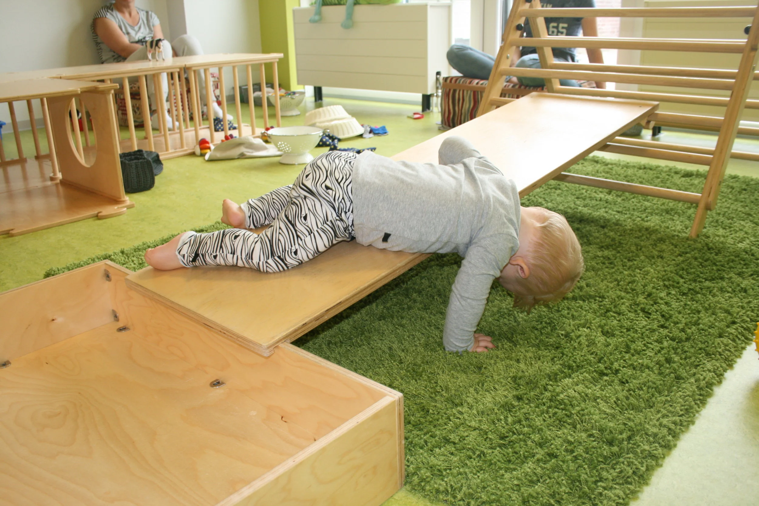 In de groepsruimte van kinderopvang Duimelot op vrijdagochtend van 9.30 tot 11.00u. In de groepsruimte staan allerlei klim- en klauter toestellen van Pikler opgesteld, tezamen met allerlei open spelmateriaal waarbij je kind verschillende materialen, vormen, groottes en gewichten kan ervaren.